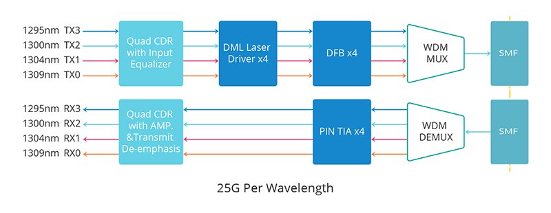 The 100G ER4 optical transmitter is operating at the LAN WDM wavelength (1295nm, 1300nm, 1305nm, and 1310nm). The four optical signals from the four wavelengths are multiplexed to transmit on SMF through an industry-standard LC connector (a WDM Mux is used to combine the wavelength signals onto a single fiber). On the receiver side, the SOA amplifies the signals before a WDM Demux splitting the signals into individual channels (the PIN receivers are used to convert the channels back to electrical signals).